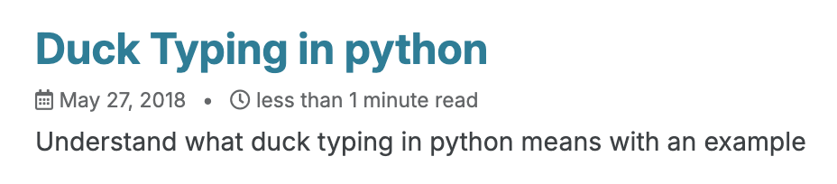 I wrote a quick humble blog on May 27, 2018 on Duck typing in python. Nothing fancy, a less than 1 minute read