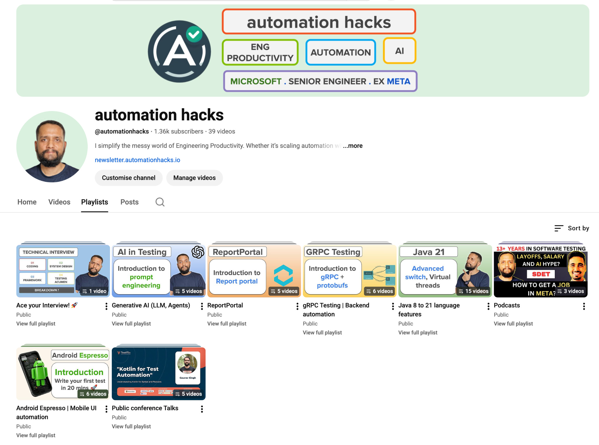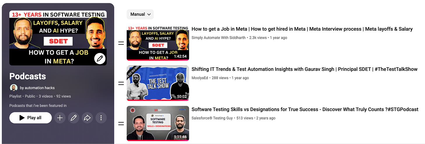 I later launched other playlists on different topics like interviewing, AI, Report portal, Grpc Testing, Java, and a few podcasts and talks that I’ve delivered over the years.